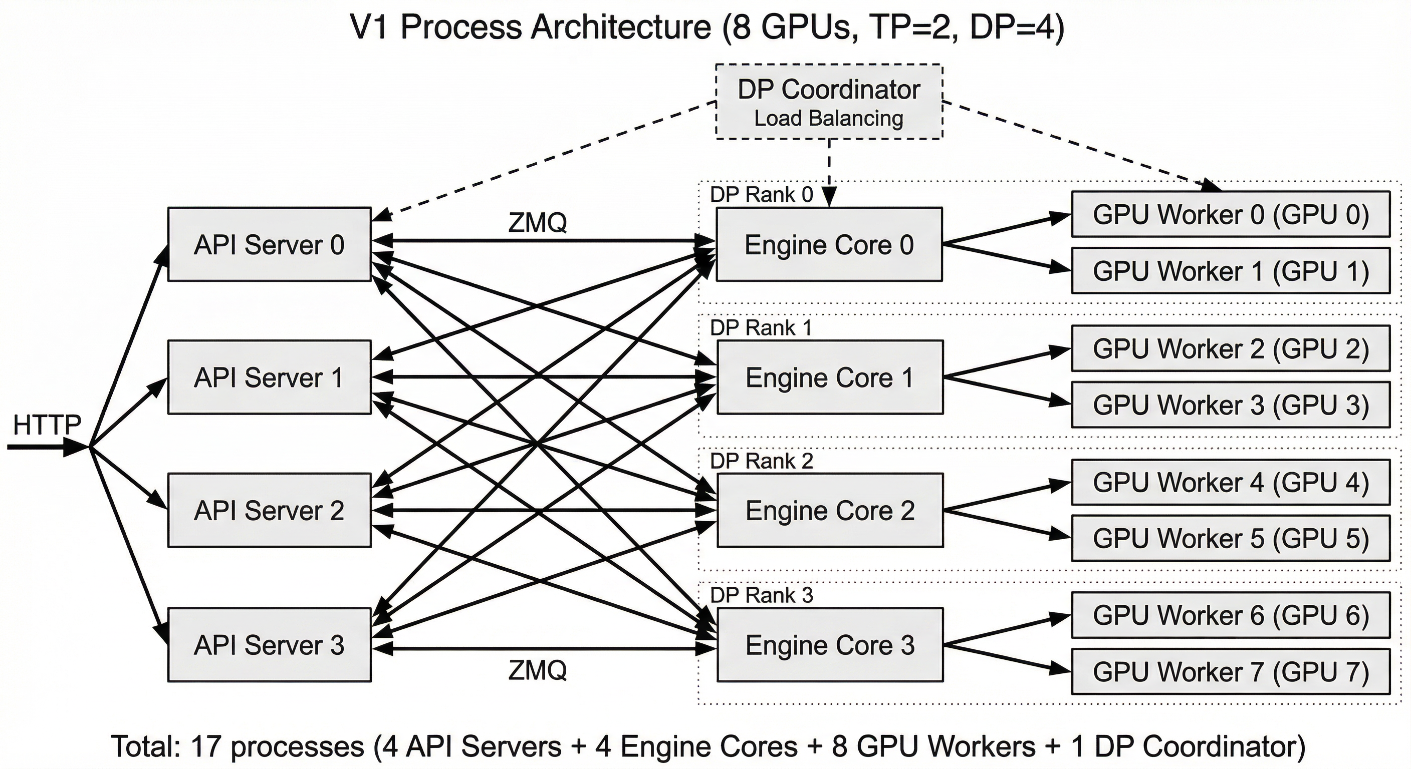 • 4 API servers + 4 engine cores + 8 GPU workers + 1 DP coordinator = 17 processes